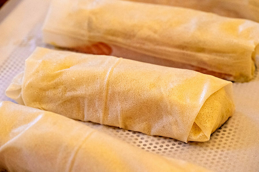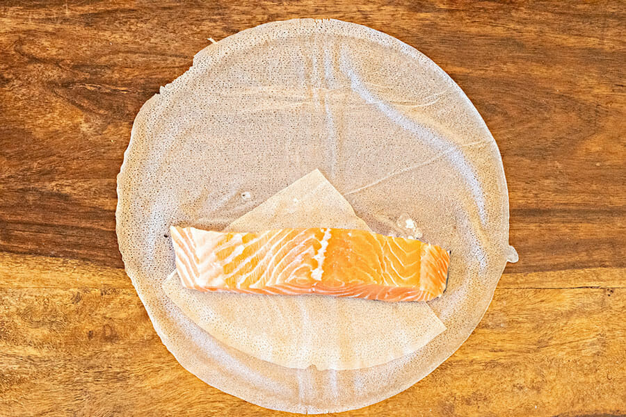 - Mettre 4 pavés de saumon, 5 feuilles de brick sur votre plan de travail.