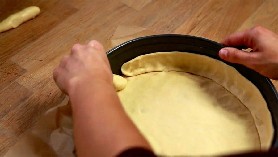 La pâte est un peu collante mais en farinant ses mains elle se laisse travailler facilement et elle est fabuleuse. Je l’ai simplement étalée au rouleau à pâtisserie et mise directement dans le moule à charnière.