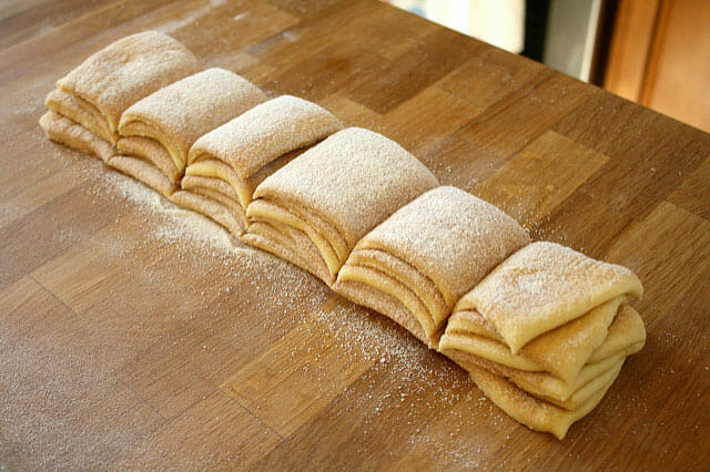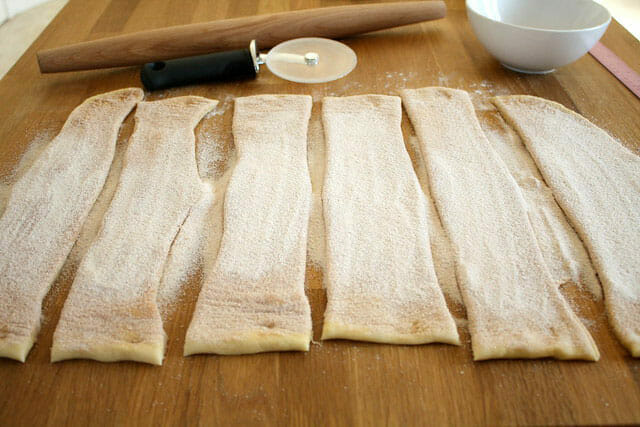- Découper la pâte à l'aide de la roulette à pizza ou à défaut d'un couteau en 6 bandes