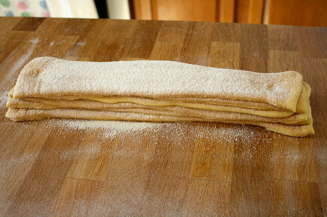 - Etaler la pate sur un plan de travail fariné avec un rouleau en un rectangle de 30x50 cm environ.