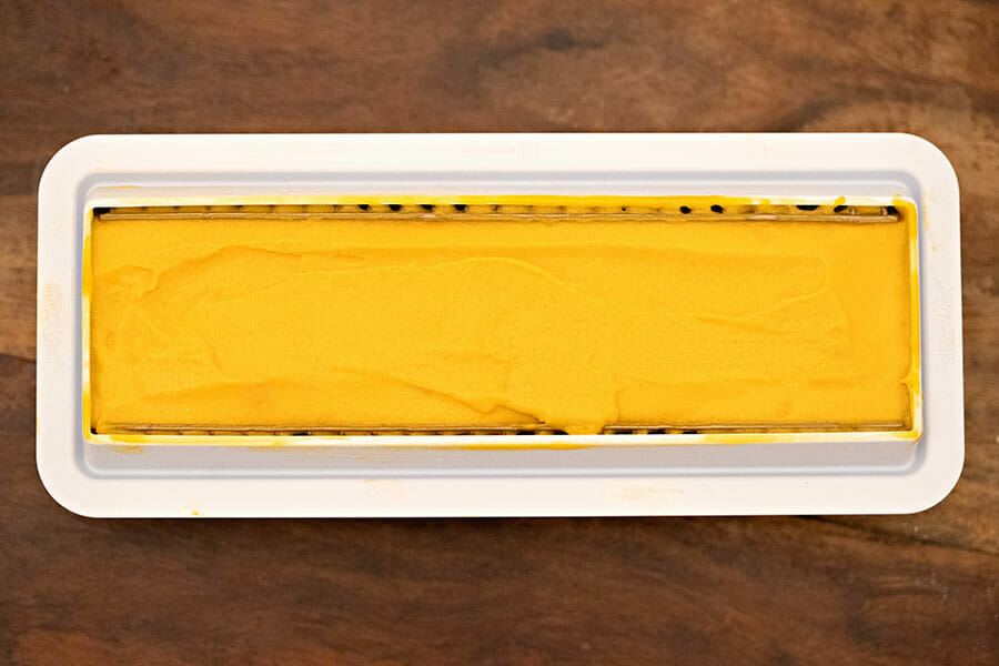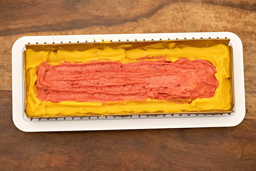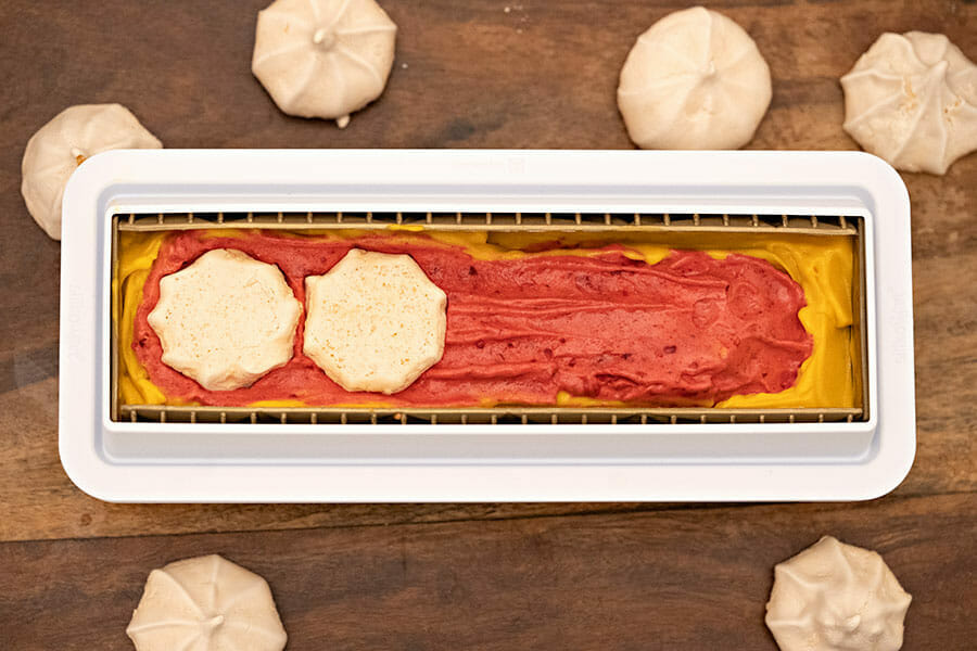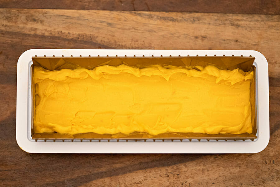 - Etaler le sorbet au centre du moule à bûche en laissant un espace sur les cotés pour pouvoir rajouter un peu de sorbet mangue.