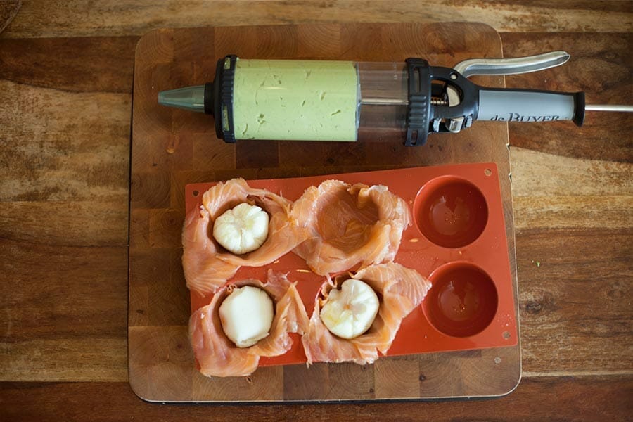 - Mettre 10 tranches de saumon fumé à répartir dans les 6 empreintes d'un moule dome en faisant déborder sur les cotés pour pouvoir rabattre par la suite..