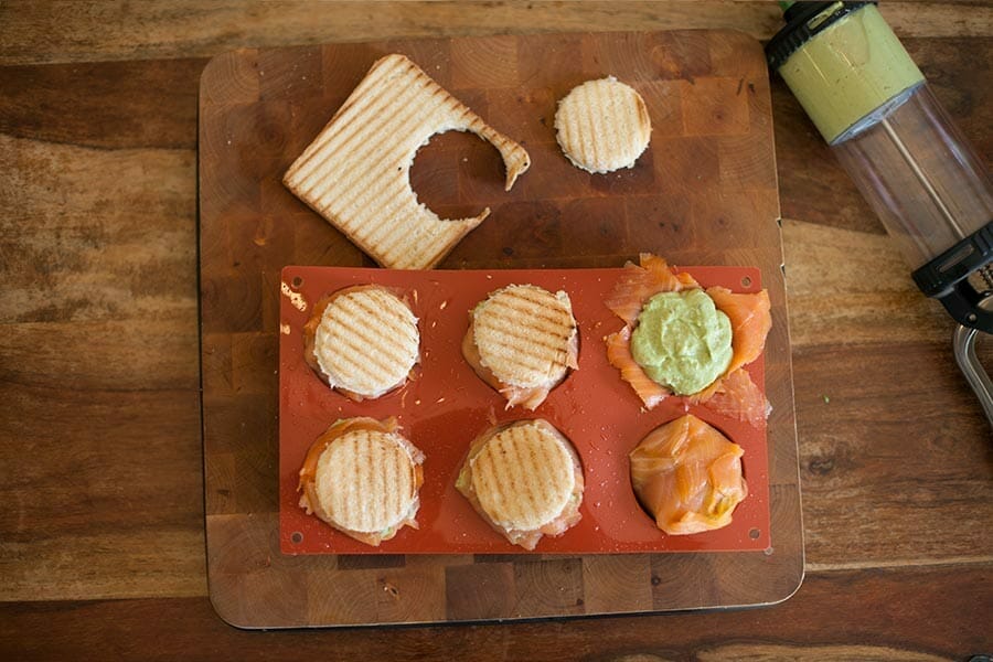 On aurait pu aussi appeler cette recette dôme de saumon fumé, cœur coulant et crème d’avocats mais cela ne rentrait pas 🙂 Pour cette recette le Thermomix se rend utile pour toutes les étapes à part peut être pour toaster le pain de mie !