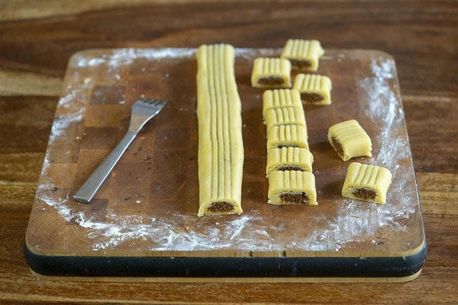 - Couper les extrémités de chaque boudins pour égaliser les bouts des figolus puis couper les biscuits tous les 3 centimètres.