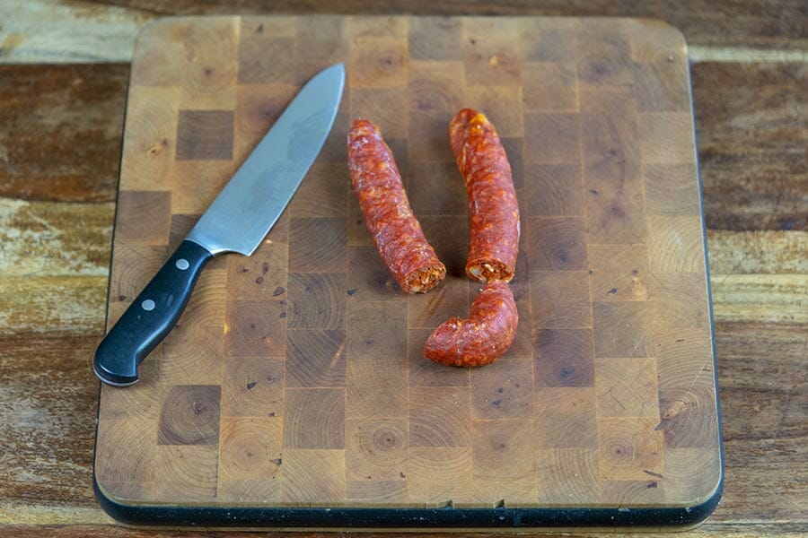 - Couper le chorizo en 2 en son centre (là ou il est plié) de manière à avoir 2 bâtons de chorizo bien droits.