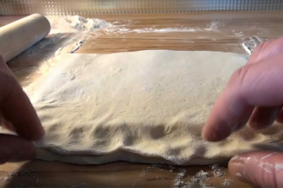 - Poser la pâte sur un plan de travail fariné et aplatissez-la en un rectangle régulier de 30 cm par 20 cm environ. .