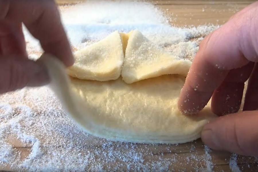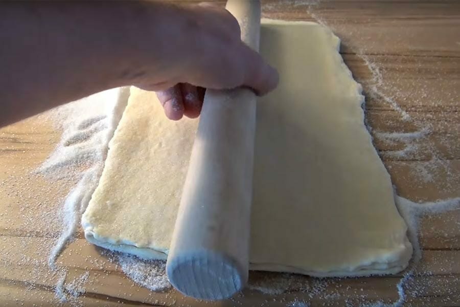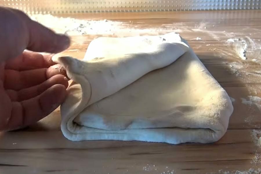 - Plier la pâte en 3 puis tournez-la d'un quart de tour comme les étapes précédentes. Sucrer la pâte.
