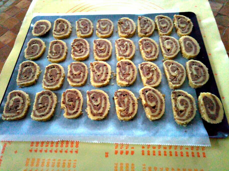 - Saupoudrer le dessus de la pâte chocolatée de 2 cuillère à soupe de noix hachées (facultatif). Former un boudin de pâte dans la longueur.