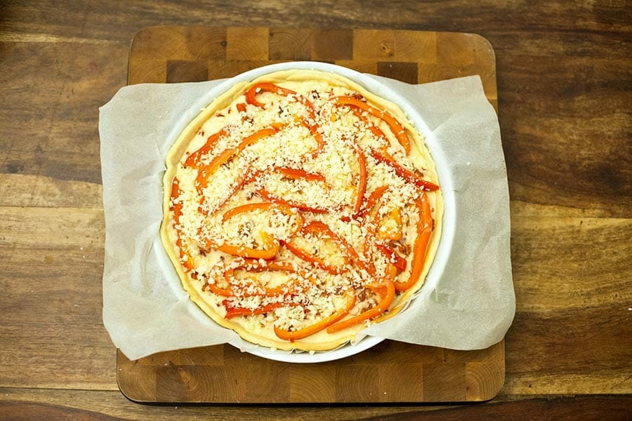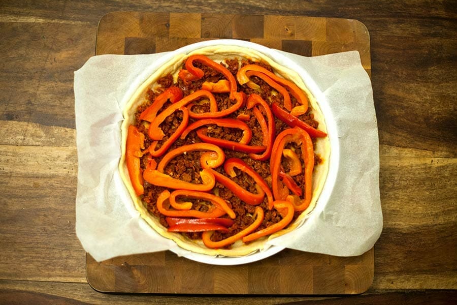 Une tarte pleine de goût aux saveurs ensoleillées: chorizo et pouvrons.