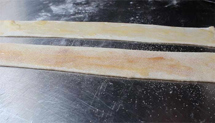 - Étaler la pâte sur votre plan de travail fariné pour former un rectangle trois fois plus long que large.