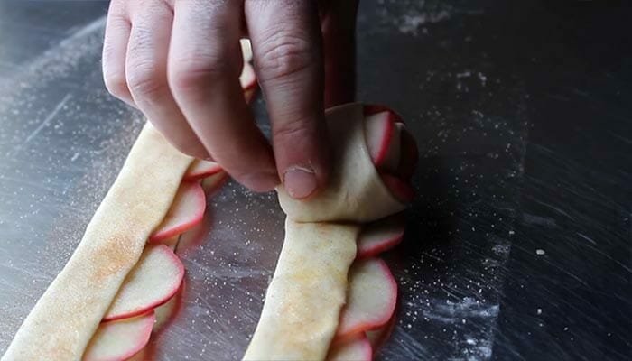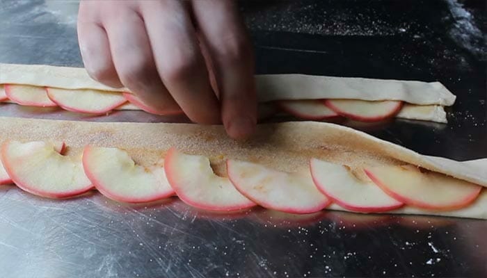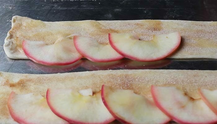 - Déposer les lamelles de pommes sur la moitié supérieure d'une bande de pate en les faisant dépasser de la pâte et se chevaucher.