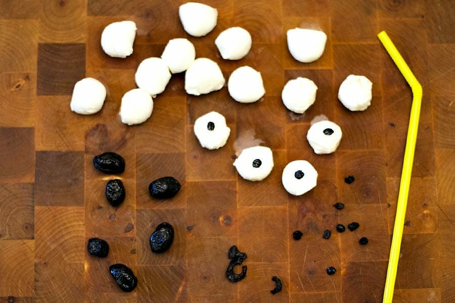 - A l'aide d'une paille, découper la pupille de vos yeux dans les olives, puis coller les sur les billes de mozzarella.