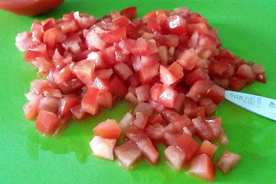 - Couper les tomates en dés avec un couteau bien aiguisé.