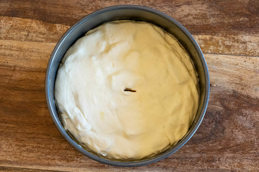 - Terminer en perçant un petit trou juste au milieu de la pâte feuilletée pour faire office de cheminée à la cuisson.